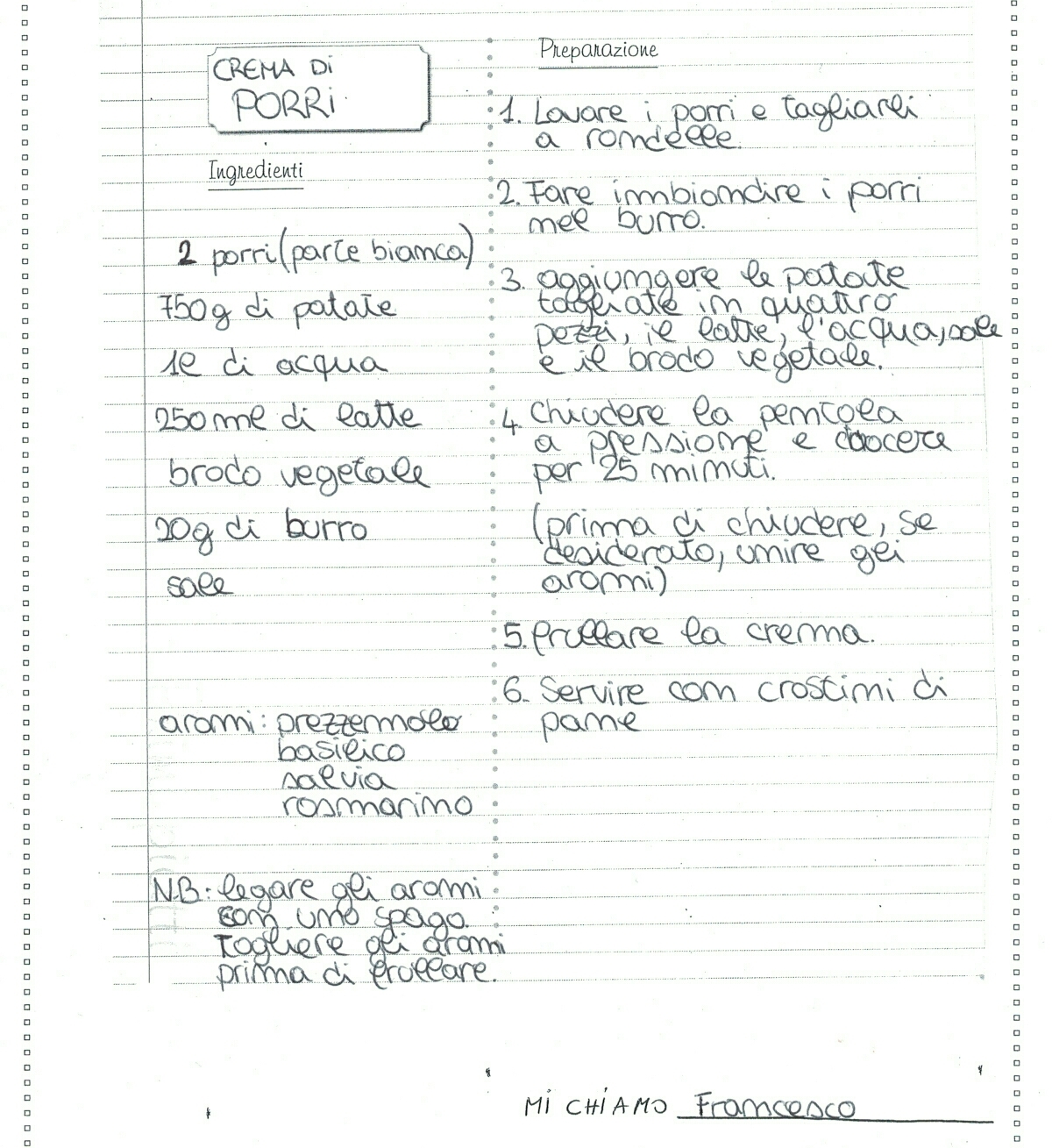 Ecco la ricetta della “Crema di porri” che mi ha inviato Francesco. E’ facile e veloce da preparare. Bastano pochi ingredienti e… la cena è pronta. Se anche tu hai una ricetta che vuoi condividere con altri bambini inviala a ortodeibambini@gmail.com (puoi anche utilizzare la scheda “Ricettario“).